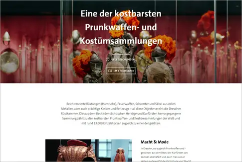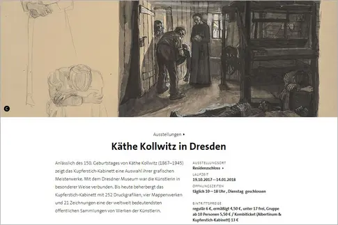 Die Startseite soll einen Überblick über die Vielfalt der Staatlichen Kunstsammlungen Dresden vermitteln und soll vor allem aktuelle und neue Inhalte aufzeigen, da vor allem wiederkehrende Museumsbesucher diese Seite besuchen. Wichtigstes Element ist der Bühnen-Slider.